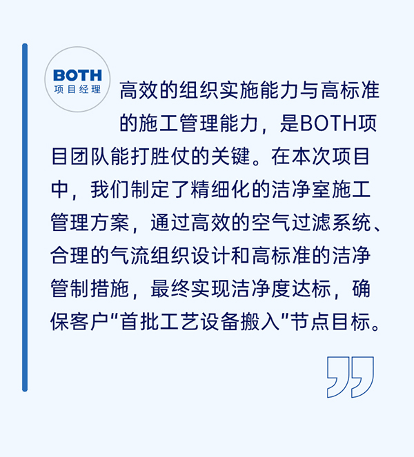 顯示面板對(duì)生產(chǎn)環(huán)境有嚴(yán)格的參數(shù)要求,潔凈標(biāo)準(zhǔn)較高。憑借在新型顯示領(lǐng)域20多年以來的成功經(jīng)驗(yàn),在本次項(xiàng)目中,BOTH發(fā)揮專業(yè)優(yōu)勢(shì),完美踐約履諾,按照“快速啟動(dòng)、高效施工、快速清退、高標(biāo)準(zhǔn)移交”要求,從前期策劃、項(xiàng)目施工,再到調(diào)試測(cè)試,僅用80余天就實(shí)現(xiàn)項(xiàng)目等各項(xiàng)潔凈指標(biāo)達(dá)標(biāo),推動(dòng)客戶項(xiàng)目快速生產(chǎn),贏得客戶認(rèn)可與贊譽(yù)。