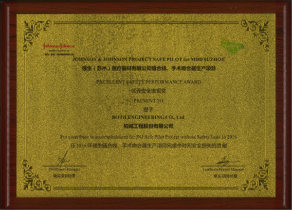 近期,我司項(xiàng)目團(tuán)隊(duì)在強(qiáng)生(蘇州)醫(yī)療器材有限公司縫合線、手術(shù)吻合器生產(chǎn)項(xiàng)目中,對(duì)無(wú)安全損失做出了貢獻(xiàn),被業(yè)主授予”優(yōu)秀安全表現(xiàn)獎(jiǎng)”。