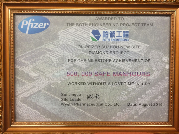 2016年8月,公司蘇州輝瑞項(xiàng)目部在近期現(xiàn)場(chǎng)安全工作中表現(xiàn)突出,業(yè)主特頒發(fā)“50萬工時(shí)安全無事故獎(jiǎng)”以示表彰。
