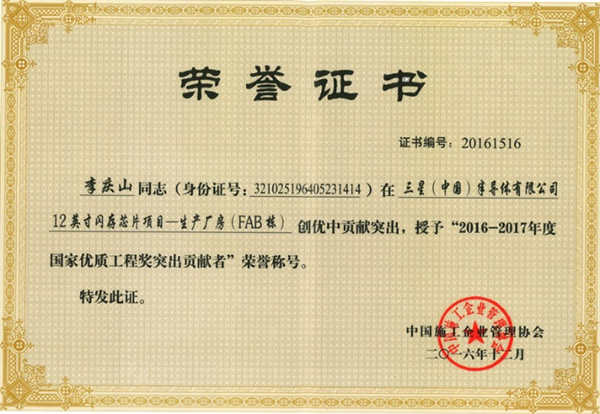 2016年12月,公司參建的三星(中國(guó))半導(dǎo)體有限公司12英寸閃存芯片項(xiàng)目-生產(chǎn)廠(chǎng)房(FAB棟)榮獲“2016-2017年度國(guó)家優(yōu)質(zhì)工程獎(jiǎng)”。