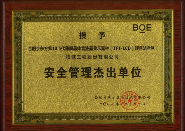 2017年12月,我公司在合肥京東方第10.5代薄膜晶體管液晶顯示器件(TFT-LCD)潔凈包項目中喜獲“安全管理杰出單位”和“杰出承包商”稱號。