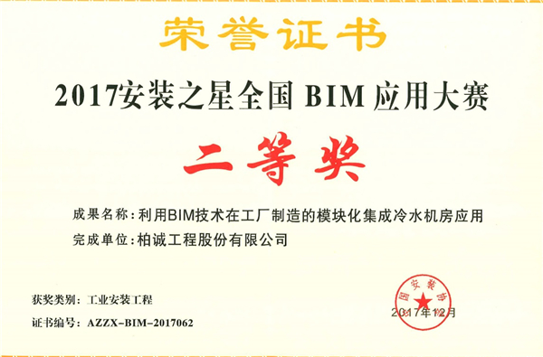 2017年12月,在中國安裝協(xié)會主辦的2017“安裝之星”全國BIM應(yīng)用大賽中,公司參賽作品“利用BIM技術(shù)在工廠制造的模塊化集成冷水機房應(yīng)用”喜獲二等獎。