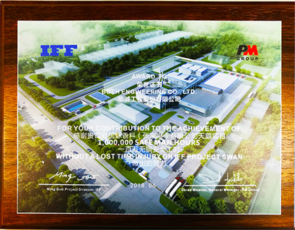 2018年6月,公司在國(guó)際香料(張家港)天鵝項(xiàng)目中喜獲“一百萬(wàn)無(wú)損安全工時(shí)獎(jiǎng)”。
