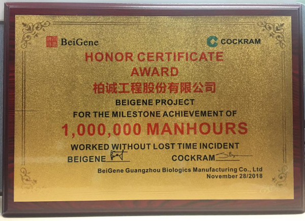 2018年12月,公司在廣州百濟神州生物制藥有限公司新廠建設(shè)項目中喜獲“100萬安全工時榮譽證書”