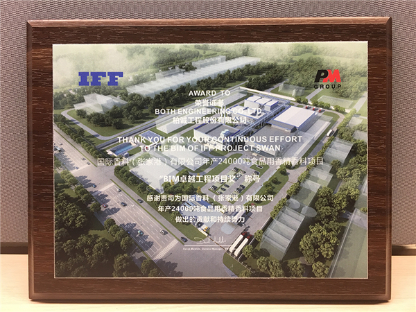 國(guó)際香料(張家港)有限公司年產(chǎn)24000噸食品用香精香料項(xiàng)目開(kāi)工至今,公司BIM團(tuán)隊(duì)及項(xiàng)目部向該項(xiàng)目提供了強(qiáng)有力的技術(shù)服務(wù),不但實(shí)現(xiàn)了預(yù)期目標(biāo),而且在節(jié)約成本、提質(zhì)增效等方面做出了顯著貢獻(xiàn)。因此業(yè)主聯(lián)合管理公司向我公司頒發(fā)了“BIM卓越工程項(xiàng)目獎(jiǎng)”予以表彰。
